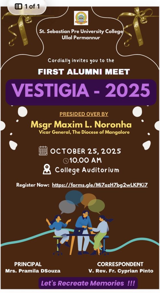 St. Sebastian Pre-University College, Ullal Permannur, is all set to host its first-ever Alumni Meet “VESTIGIA – 2025” on October 25, 2025, at 10:00 AM in the college auditorium.